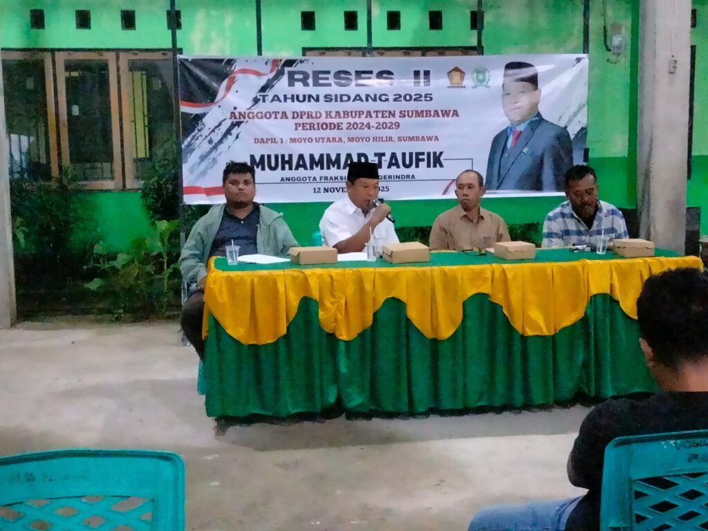 Sumbawa Besar, Merdekainsight.com – Anggota DPRD Kabupaten Sumbawa dari Fraksi Partai Gerindra, Muhammad Taufik, melaksanakan Reses II Tahun Sidang 2025 di Dusun Penyaring B, Desa Penyaring, Kecamatan Moyo Utara, pada Rabu (12/11/2025). Kegiatan yang berlangsung di Kantor Desa Penyaring ini dihadiri Kepala Desa Penyaring, Ketua BPD, kepala dusun, tokoh agama, tokoh masyarakat, tokoh pemuda, serta masyarakat setempat.
