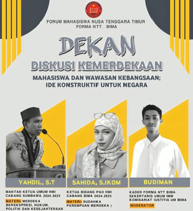 Sumbawa Besar, Merdekainsight.com — Forum Mahasiswa Nusa Tenggara Timur (FORMA NTT) – Bima menggelar diskusi kemerdekaan bertema “Mahasiswa dan Wawasan Kebangsaan: Ide Konstruktif untuk Negara” pada Senin malam (18/8), pukul 20.00–22.30 WITA, secara daring melalui Google Meet. Kegiatan ini diikuti perwakilan organisasi mahasiswa NTT dari berbagai daerah di Indonesia.