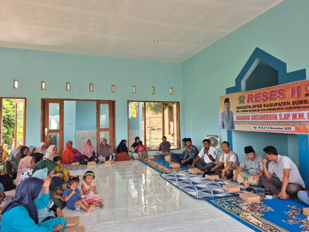 Sumbawa Besar, Merdekainsight.com – Kegiatan reses masa sidang II tahun 2025 Ketua DPRD Kabupaten Sumbawa, Nanang Nasiruddin, S.AP., M.M.Inov, di Desa Mokong, Kecamatan Moyo Hilir, Kamis (13/11/2025), menjadi ruang bagi masyarakat untuk menyampaikan sejumlah kebutuhan mendasar. Salah satunya adalah pembangunan pagar dan paving blok di area musholla.
